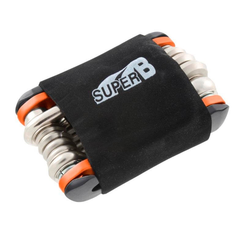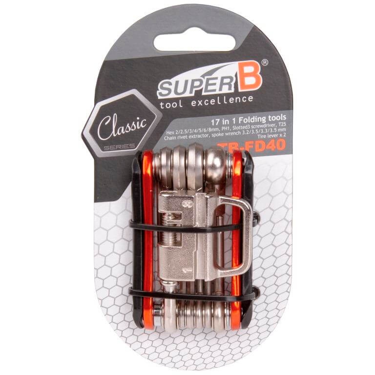 Multi náradie Super B TB-FD40 je veľmi kompaktné náradie so 15 funkciami vrátane montážnych pák a nitovačky reťaze. Súčasťou balenia je praktický neoprénový návlek.Parametre