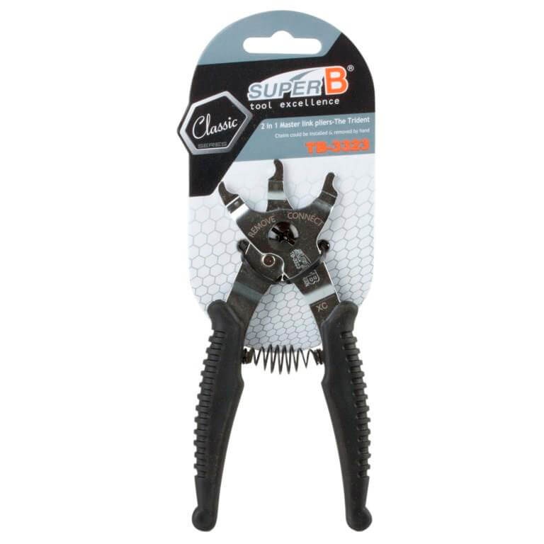 Kliešte na rýchlospojku reťaze Super B TB-3323 sú určené k ľahkému rozpojeniu a spojeniu rýchlospojky reťaze. Kliešte majú pogumovanú rukoväť a pružinu pre ľahkú manipuláciu. Sú vhodné pre všetky bežne dostupné reťazové spojky ako napr. SRAM Powerlink alebo KMC Missing Link.Parametre