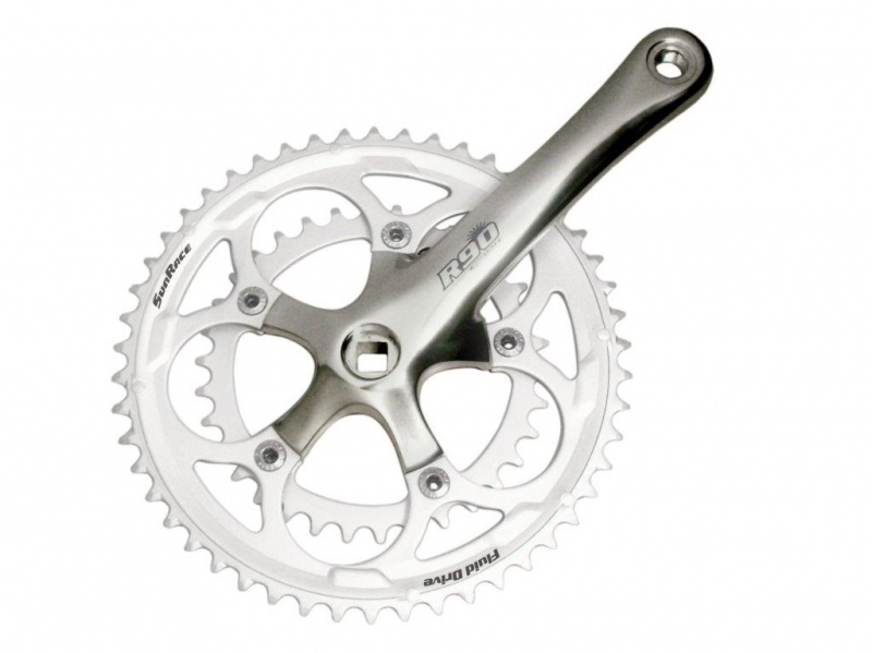 Kľuka s dvojprevodníkom SunRace FCR96 pre 2 x 9 stupňové radenie v modernom dizajne. S kompaktným prevodníkom 50/34 pe montáž so 4-hrannou stredovou oskou. Patentovaný systém Super Fluid Drive.Súčasťou dodávky nie je stredové zloženie!