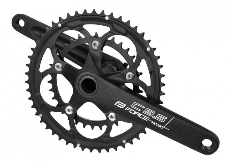 Kľuky s dvojprevodníkom Force Road C9.5 s integrovanou oskou pre 2 x 9 stupňové radenie v modernom čiernom dizajne. S hliníkovým a oceľovým prevodníkom 50/34. Súčasťou dodávky aj stredové misky.Parametre