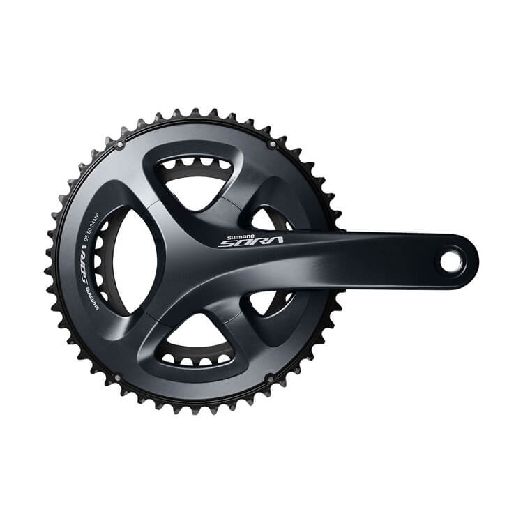 Kľuka s dvojprevodníkom Shimano Sora FC-R3000 pre 2 x 9 stupňové radenie v modernom dizajne. S hliníkovými prevodníkom 50/34 a integrovanou oskou.