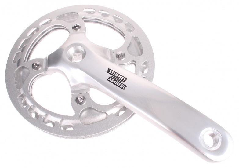 Hliníková kľuka s oceľovým jedno prevodníkom Sturmey Archer FCS722 v štýlovom striebornom prevedení a s hliníkovým vonkajším a oceľovým vnútorným krytom prevodníka. Vášmu single speed bicyklu dodajú štýl a nezabudnuteľný zážitok z jazdy.Parametre