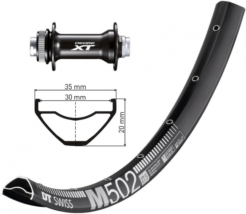 Koleso predné 27,5" s dvojstenným hliníkovým ráfikom DT Swiss M 502 Disc a hliníkovým nábojom Shimano Deore XT HB-M8010. Určené pre horské bicykle s kotúčovou brzdou a pripojením kotúča Centerlock.Parametre