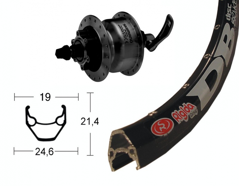 Koleso predné 28" s dvojstenovým hliníkovým ráfikom Ryde ZAC 2000 Disc a hliníkovým nábojom Shimano DH-3D30 so zabudovaným dynamom. Pre kotúčové brzdy s upínaním kotúča IS 2000.Parametre
