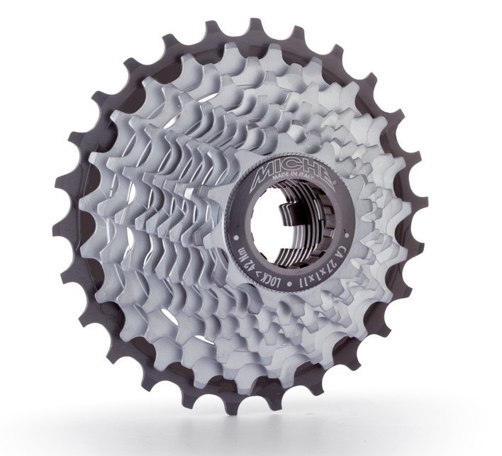 Kazeta 11 st. Miche, kompatibilná s Campagnolo výbavou. 8-12% redukcia hmotnosti oproti predchádzajúcej verzii. Prvý a druhý stupeň z matnej chrómovej ocele. Najväčší pastorok a matice z tvrdo eloxovaného hliníka 7075-T6.Parametre