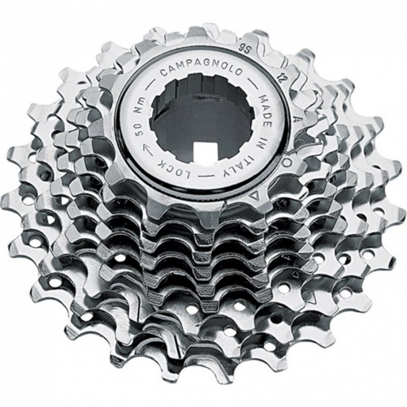 Kazeta 9 st. Campagnolo Veloce CS03-EC. Profil zubov s geometriou Ultra-Drive ™, ktorý uľahčuje prechod reťaze medzi pastorkami a tým zaručuje presné, rýchle a tiché radenie. Pastorky sú pochrómované pre vyššiu odolnosť proti korózii. Dodáva sa bez matice.Parametre