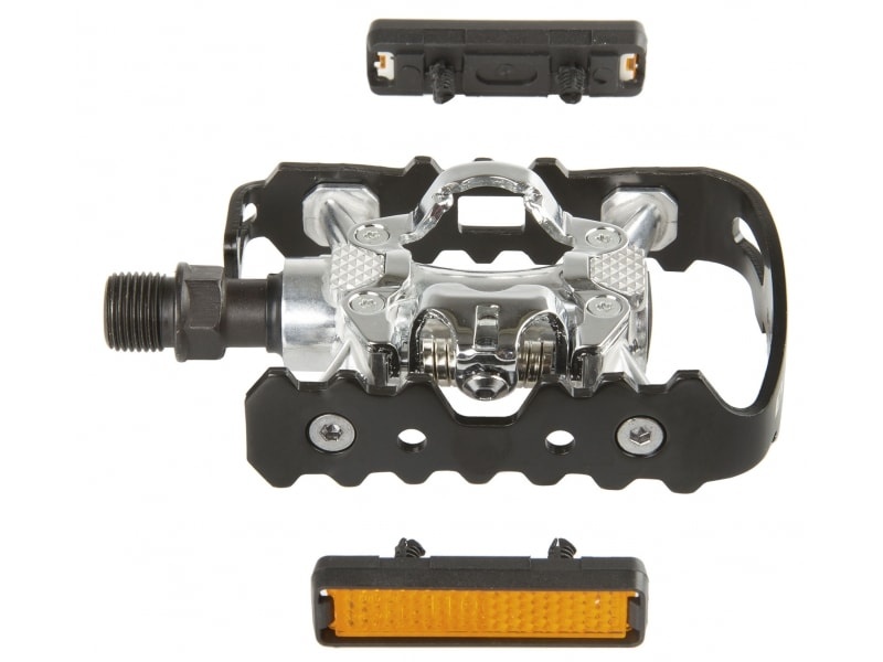 Jednostranný nášlapný pedál Exustar E-PM818 s hliníkovým telom a rámom a CroMo oskou určený pre trekingové bicykle. Pedál určený pre začínajúcich jazdcov jazdiacich s obyčajnými topánkami ale aj cyklo tretrami. Pedál má na jednej strane nastaviteľný SPD zámok pre jednoduché nacvaknutie/vycvaknutie tretry z pedálu. Druhá strana pedálu je určená pre obyčajné topánky. Kompatibilné so Shimano SPD systémom. Dodávané vrátane kufrov.Parametre