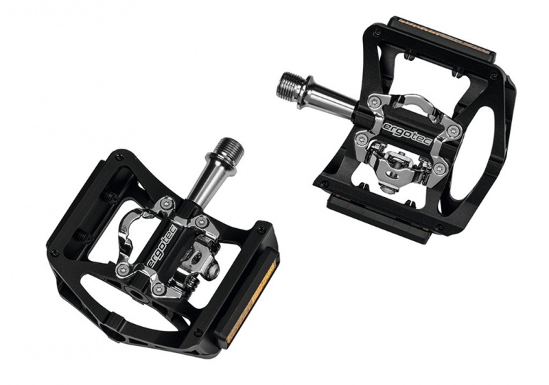 Jednostranný nášlapný pedál Ergotec EP Superlight Binding je športovou verziou pedálu Ergotec EP-1. Má hliníkové konkávne telo a rám optimalizujúce prenos sily a CroMo osku. Pedál je určený pre mestské a trekingové bicykle a pre jazdcov jazdiacich s obyčajnými topánkami, ale aj cyklo tretrami. Pedál má na jednej strane nastaviteľný SPD zámok pre jednoduché nacvaknutie/vycvaknutie tretry z pedálu. Druhá strana pedálu je určená pre obyčajné topánky, poloha ktorých zabezpečuje osem pinov. Kompatibilné so Shimano SPD systémom. Dodávané vrátane kufrov.Parametre